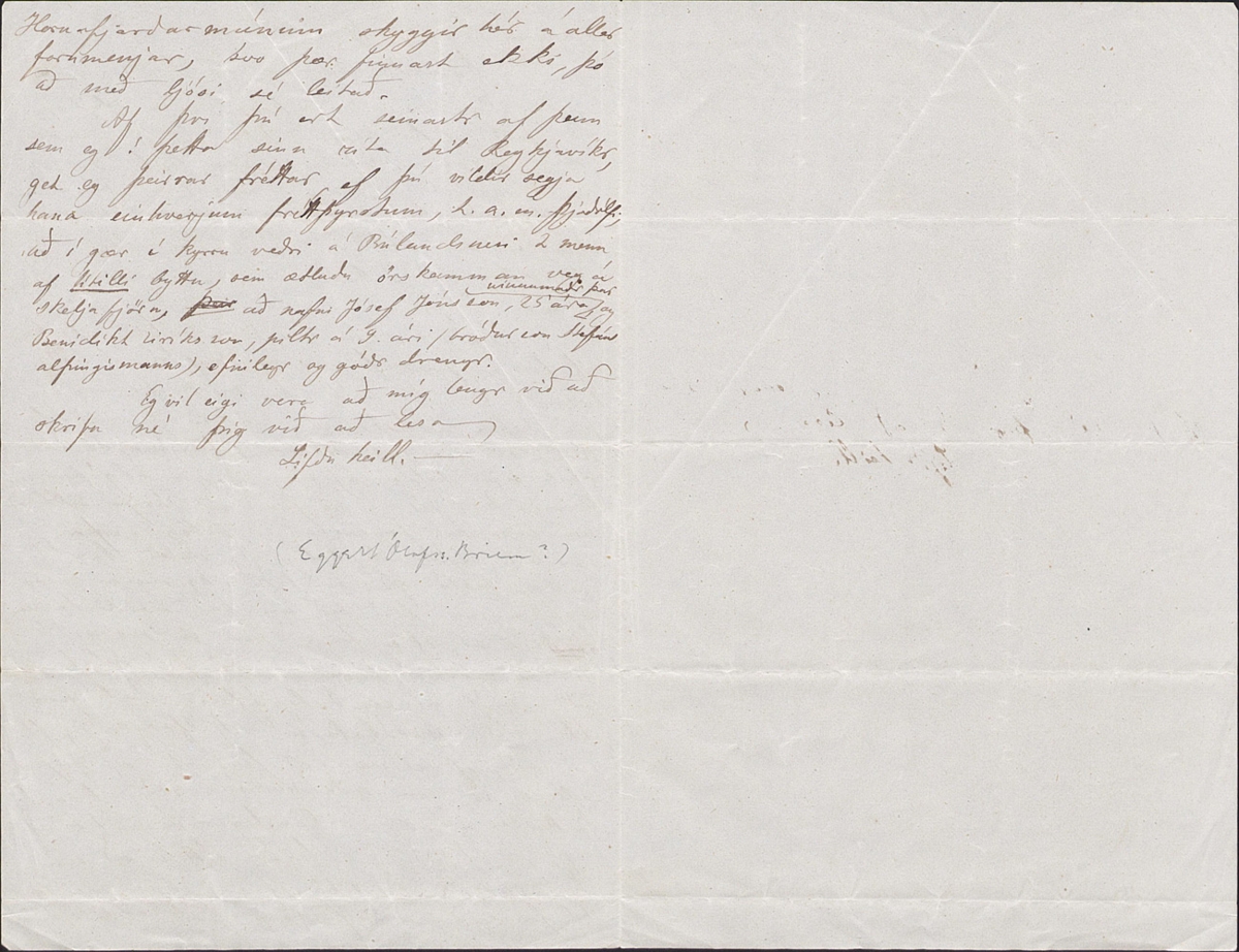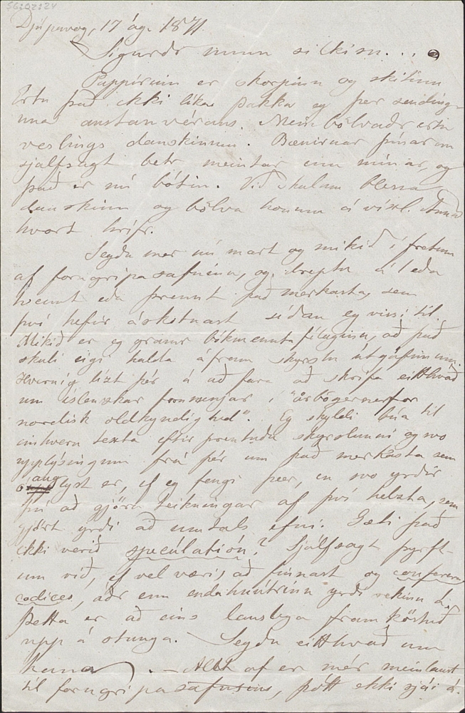 Bréf frá Eggert Ó. Briem, presti, Höskuldsstöðum. 13,1 x 20,9 cm. Dagsett 17.1871. Efni: Viðhorf til Dana. Forngripasafnið og skýrslan um það. Möguleikar á að Sigurður fari að skrifa í Aarboger nordisk oldlyndighed. Frétt um bátstapa þar eystra.