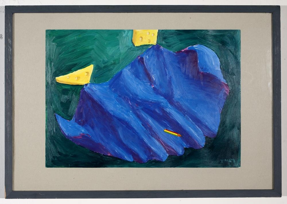 Blátt abstrakt form er fyrir miðju. Neðarlega á því er lítill blýantur sem er gulur, rauður og grænn á litinn. Fyrir ofan geómetríska formið eru tveir gulir ostar. Bakgrunnur er grænn. Verkið er í viðarramma sem málaður hefur verið grár. Pappi utan um verk er brún-grátt.