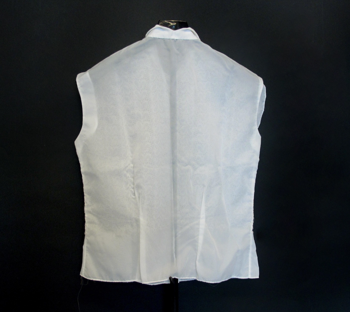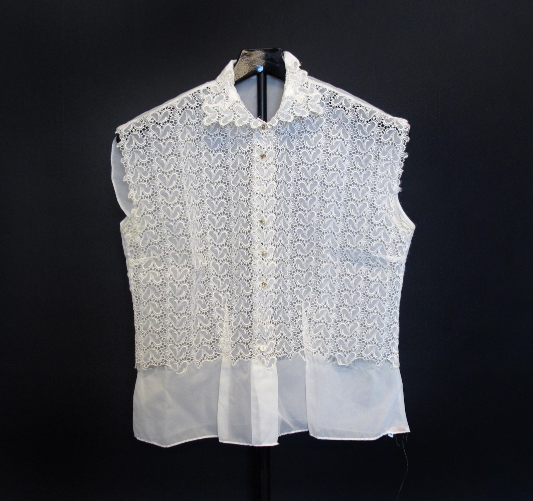 Kvenblússa úr hvítu perlon efni. Blúndumynstur að framanverðu. Blússan er ermalaus. Henni er hneppt að framanverðu. Af upprunalegum hnöppum eru fimm eftir en sjá má að nokkrir hafa tapast. Þessir hnappar hafa verið með þremur hvítum perlum í, en einungis eru ein til tvær perlur í þeim hnöppum sem eftir eru. Í stað nokkurra hnappa sem hafa tapast hafa plasttölur verið saumaðar á. Skyrtan er rifin í mittið á báðum hliðum (við samskeytin við blúnduefnið) en er annars í nokkuð góðu ástandi. Við fald að neðan eru saumaðir tveir litlir miðar. Á öðrum stendur: perlon og á hinum númerið 44 sem er stærð blússunnar. Blússan er úr eigu móður gefanda og er saumuð af Dýrleifu Ármann kjólameistara.