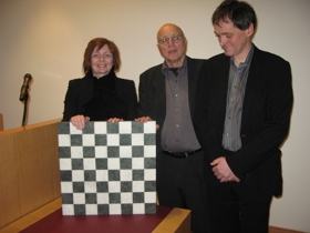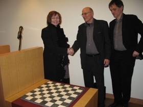 Hér í skjalinu fylgja tvær myndir frá afhendingu skákborðsins í Þjóðminjasafninu. Á myndunum eru Margrét Hallgrímsdóttir Þjóðminjavörður sem tók við borðinu fyrir hönd safnsins, Guðmundur G. Þórarinsson, gefandi skákborðsins, og Helgi Ólafsson stórmeistari í skák.