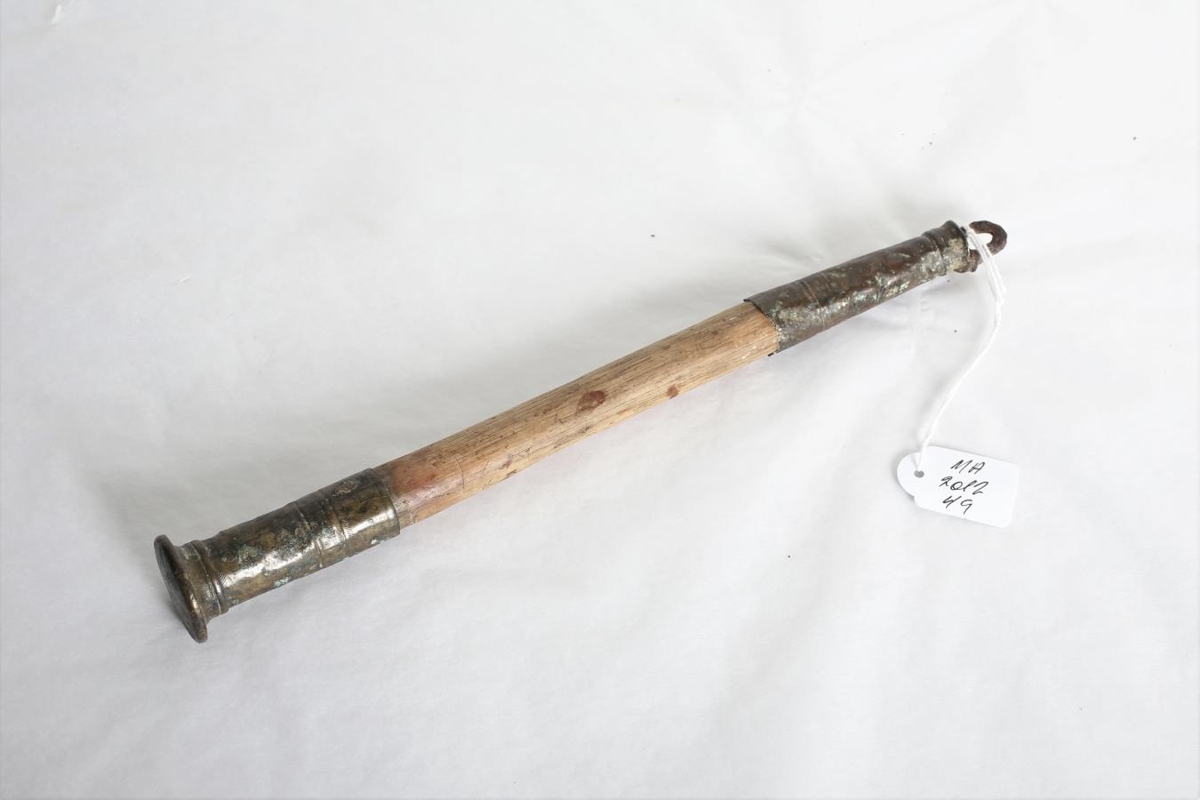 Mjög gamalt svipuskaft, frekar stutt. Viður er í skaftinu en málmur á hvorum enda - líklega kopar eða messingblanda. Hringlaga flatur endi er efst sem er um 3 cm í þvermál. Málmurinn er ekki mikið skreyttur. Framan á skaftinu hefur nagli eða hóffjöður verið rekin upp í skaftið og beyt í auga til að hægt væri að setja halann í. Naglinn er mjög ryðgaður.