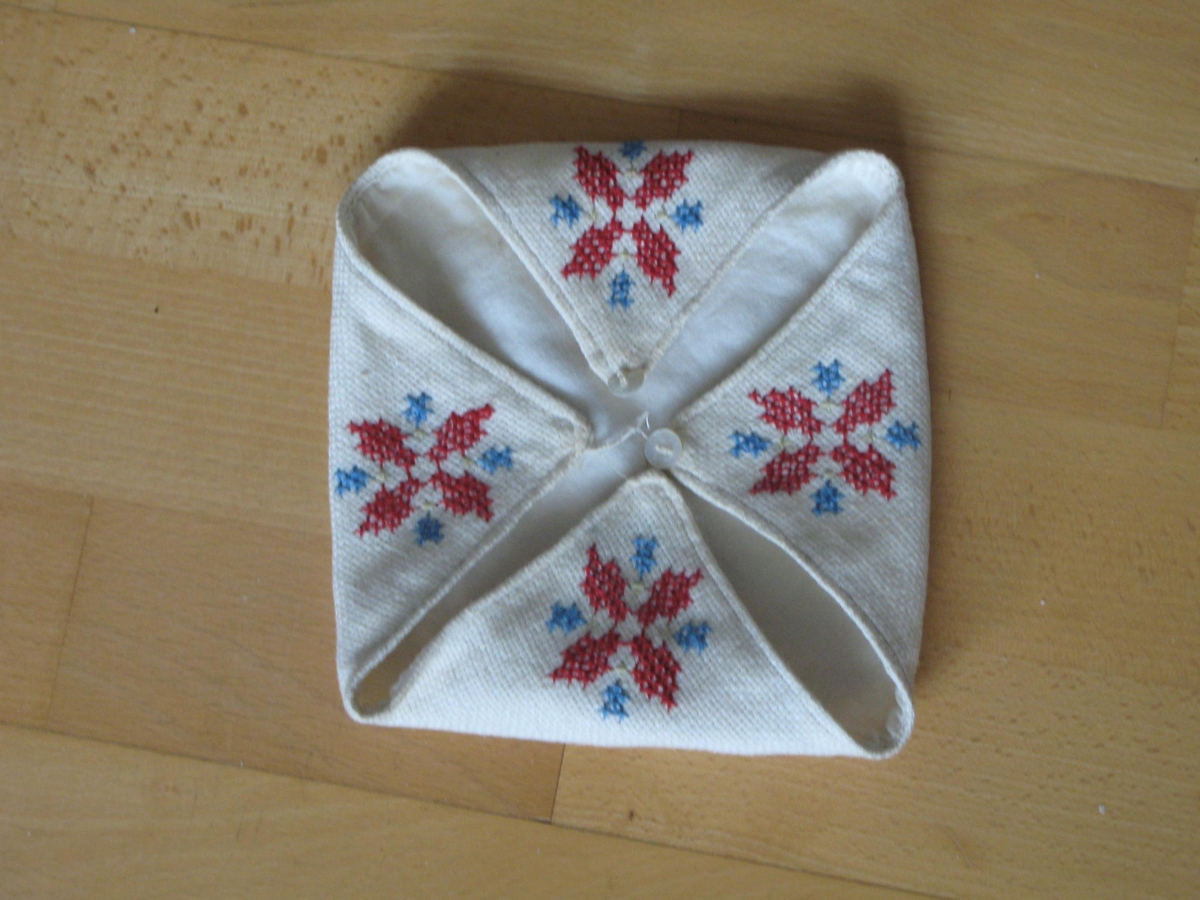 Hvítt ferkantað stykki úr bómullarjava og fóðrað með lérefti. Útsaumað með rauðum og bláum krossaumi sem myndar rós. Fjórar rósir, ein í hverju horni. Þetta stykki er notað til að geyma vasaklúta.