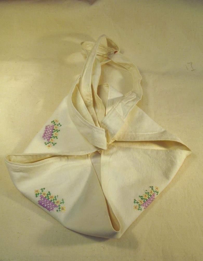 Ferkantað stykki þar sem saumað er út í fjögur horn með krossaumi. Útsaumurinn er blómakarfa með fjólubláum og gulum og grænum litum. Fjögur bönd úr lérefti saumuð saman í miðju og fer hvert band í eitt horn. Stafirnir "Á. E" eru saumaðir í með fjólubláu í körfuna sem myndast og er til að hengja upp og geyma hluti í.