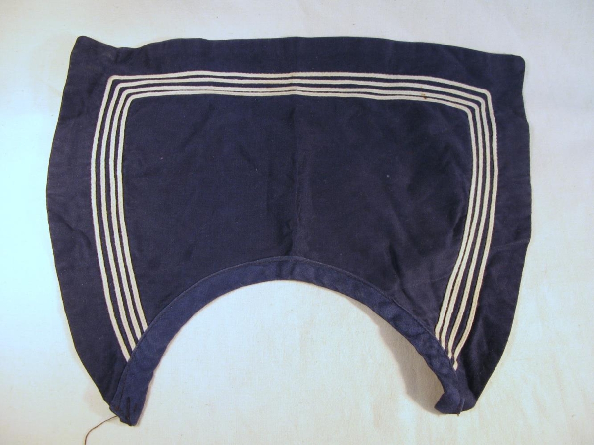 Dökkblár matrósarkragi á barn. Kraginn er með hvítum röndum og ljóst léreft er undir kraganum. Líklega af Jóni Kristberg þegar hann var lítill.