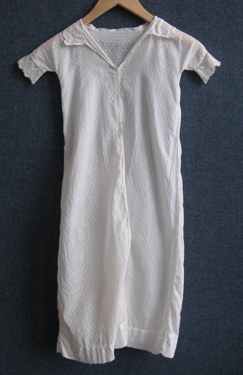 Hvítur barnakjóll sem við teljum að sé skírnarkjóll. Kjóllinn er alveg opinn að aftan, aðeins hnepptur efst í hálsi. Ermar mjög stuttar. Hvít 5,5 cm blúnda í hálsinn og blúnda framan á ermum. Efnið er mjög þunnt léreft með hvítum þéttofnum doppum yfir allt efnið.
