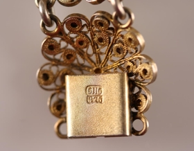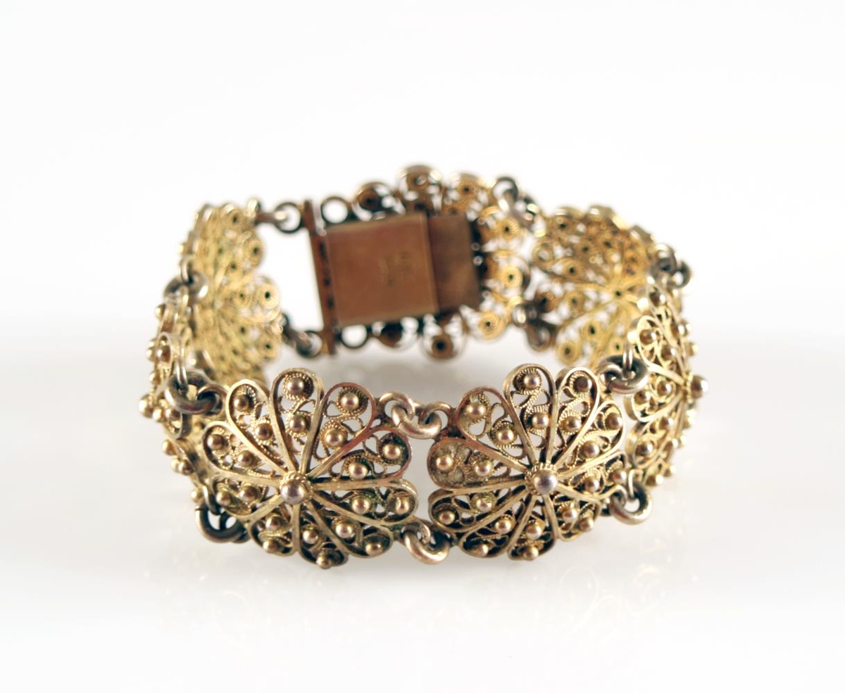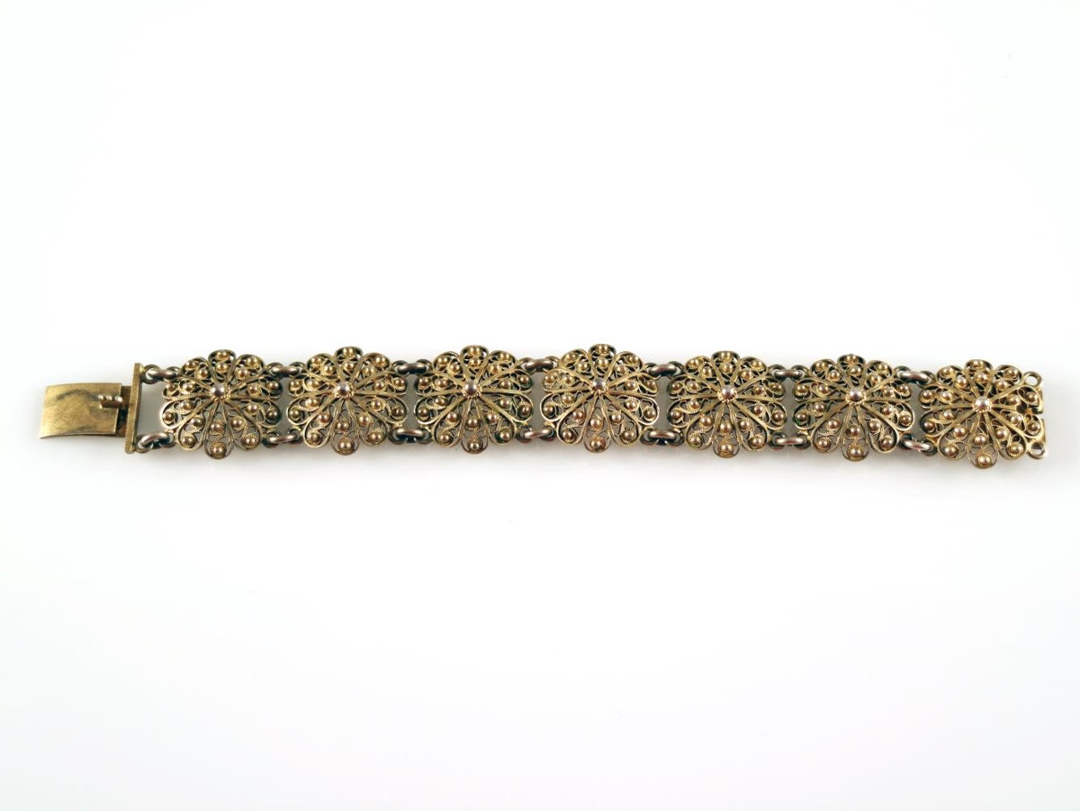Víravirkisarmband úr gylltu silfri. Stimplað GHG sem er smiðsstimpill Guðmundar Helga Guðnasonar gullsmiðs í Reykjavík (f. 1884, d. 1953). Fyrir neðan smiðsstimpilinn er gæðastimpillinn 925, þ.e. sterlingsilfur (92,5% silfur). Armbandið er samsett úr 7 víravirkisblómum sem hlekkjuð eru saman. Hvert víravirkisblóm er 2,4 x 2,2 cm. Heildarlengd armbandsins (mælt með smellu) er 19,2 cm. Það er heilt og í mjög góðu ástandi. Ekki er vitað hver átti armbandið.