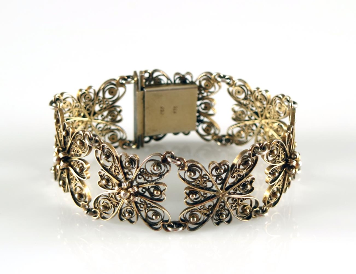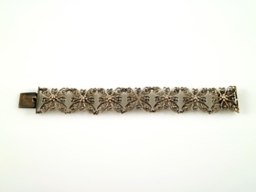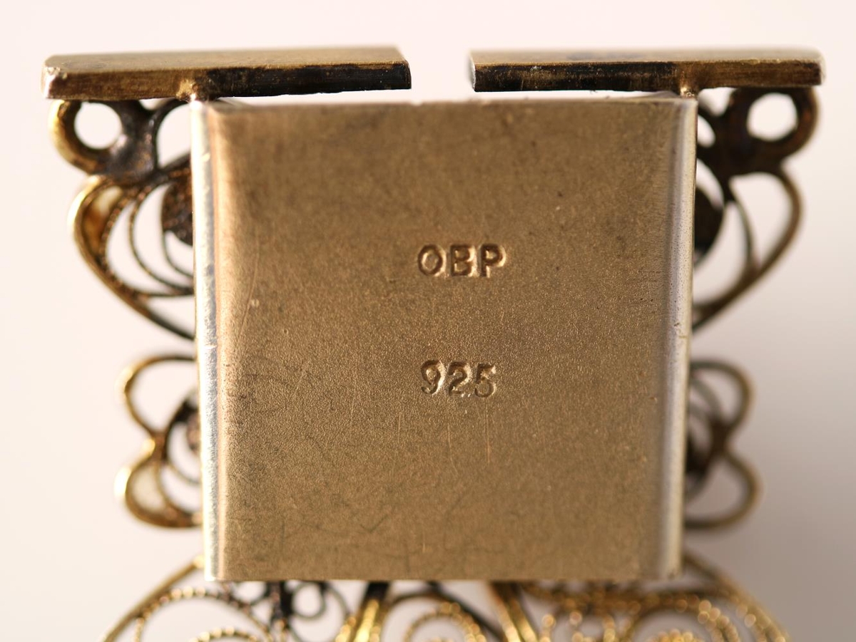 Víravirkisarmband úr gylltu silfri. Stimplað OBP sem er smiðsstimpill Óskars Benedikst Péturssonar, gullsmiðs í Reykjavík (f. 1909, d. 1999). Fyrir neðan smiðsstimpilinn er gæðastimpillinn 925, þ.e. sterlingsilfur (92,5% silfur). Armbandið er samsett úr 7 víravirkisblómum sem hlekkjuð eru saman. Fyrir miðju hverju blómi er kornsett rósetta. Hana vantar þó á miðjublómið. Hvert víravirkisblóm er 2,5 x 2,6 cm. Heildarlengd armbandsins (mælt með smellu) er 20,5 cm. Fyrir utan rósettuna sem vantar er armbandið heilt og í mjög góðu ástandi. Ekki er vitað hver átti armbandið.