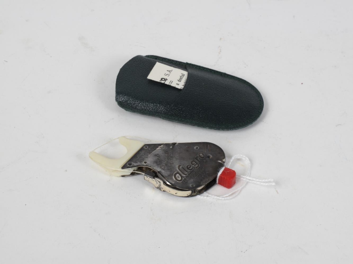 Tannþráðsskammtari - tannþráðsáhald. Silfurplettað málmáhald með innbyggðri tannþráðsrúllu.