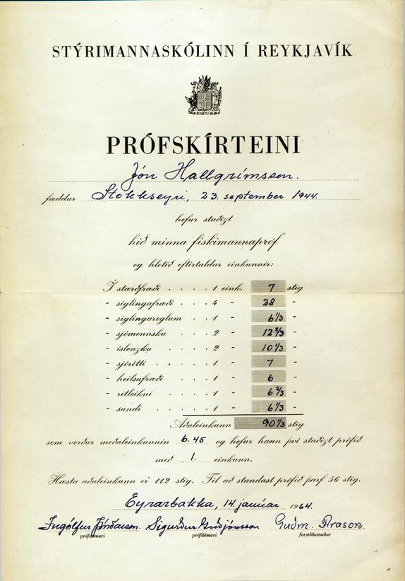 Prófskírteini og einkunnir Reynis Böðvarssonar. "Hefur staðist hið minna fiskimannapróf og hlotið eftirtaldar einkunnir: Aðaleinkunn 90 1/3 stig" dagsett 14. janúar 1964.