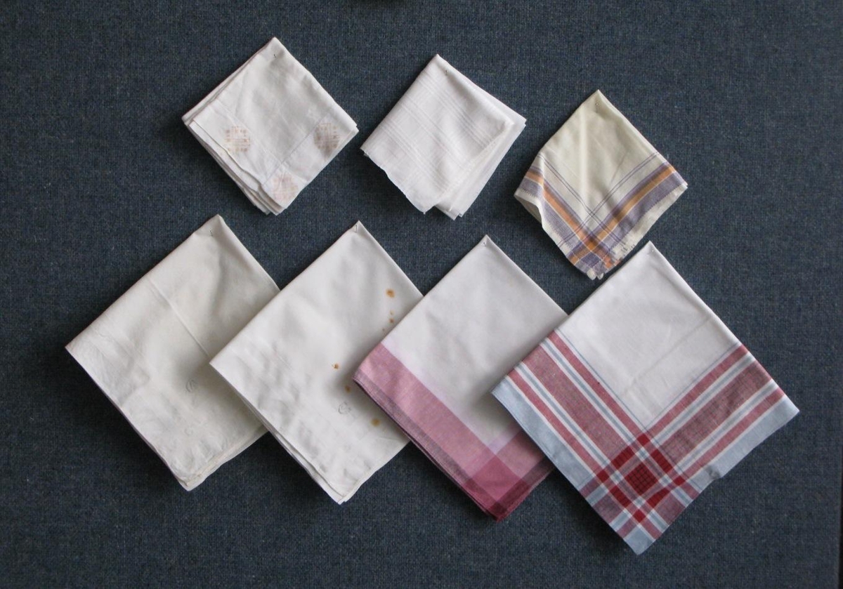 Sjö stykki af karlmannsvasaklútum. Tveir eru alveg hvítir og merktir með bókstafnum E. Tveir eru hvítir með röndum og köflum í jaðrinum. Einn lítill hvítur með fjólubláum og gulum röndum á jaðri. Einn stór alveg hvítur en ofnum röndum á jaðri og einn alveg hvítur en faldur er með gulbrúnu munstri.