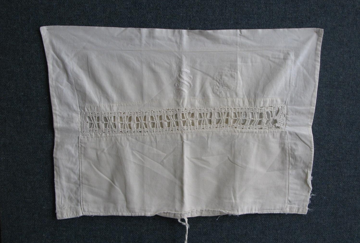 Hvítt koddaver sem líklega er gert úr hveitipokum. Heklað milliverk sem er 40x50 cm. Stafurinn S. (Anna Sigríður Olsen sem var móðir Ástu) er saumaður með flatsaumi. Koddaverið viðgert að framan en er rifið að aftan þó það sé marg viðgert.