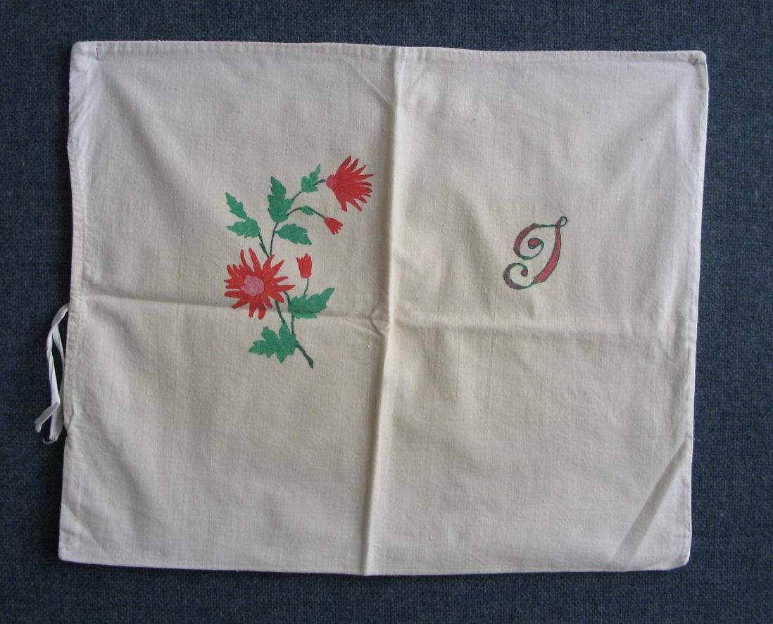 Lítið gult koddaver með ámálaðri rauðri rós, grænum blöðum og stafnum J sem er rauður í miðju og grænn utan með. Hefur tilheyrt Jóni bróðurr gefanda.