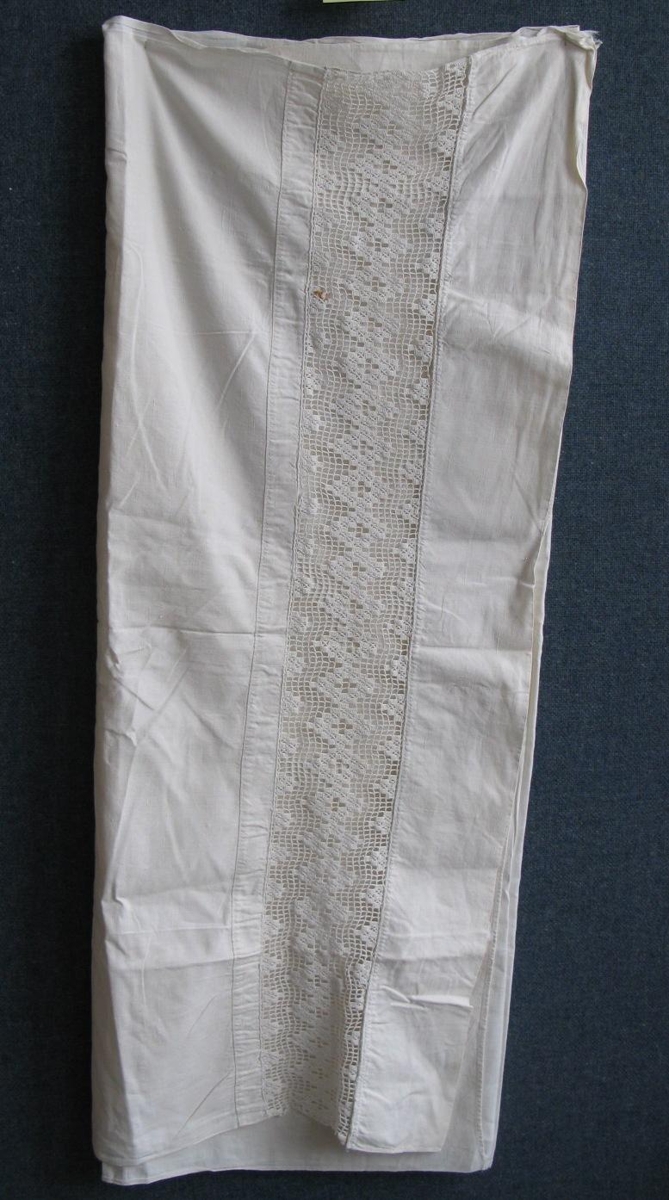 Hvítt einfalt lak eða ver, sem notað var sem "yfirsæng". Það er með 13 cm breiðu, hekluðu milliverki og er í góðu ásigkomulagi. Saumað af Önnu Sigríði Olsen.