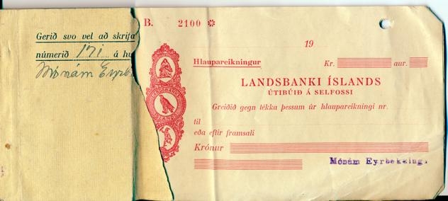 Ávísunarhefti frá Landsbankanum á Selfossi. Ein ávísun er eftir í heftinu.