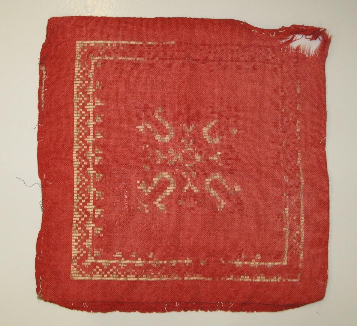 Rautt púðaver úr ullarjafa, útsaumað með goblínsaumi. Þetta er mjög slitið ver og hefur bakinu verið sprett af og er útsaumurinn horfinn að miklu leyti. Að öllum líkindum mjög gamalt (líklega frá móður Önnu Sigríðar) og hefur að öllum líkindum verið varðveitt til að nota munstrið. Saumað af Önnu Sigríði Olsen.