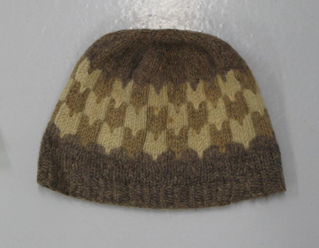 Útprjónu húfa úr mórauðu, ljósu og brúnu ullargarni. Var í eigu Jóns Kristbergs Erlendssonar en prjónuð af Ástu Erlendsdóttur.