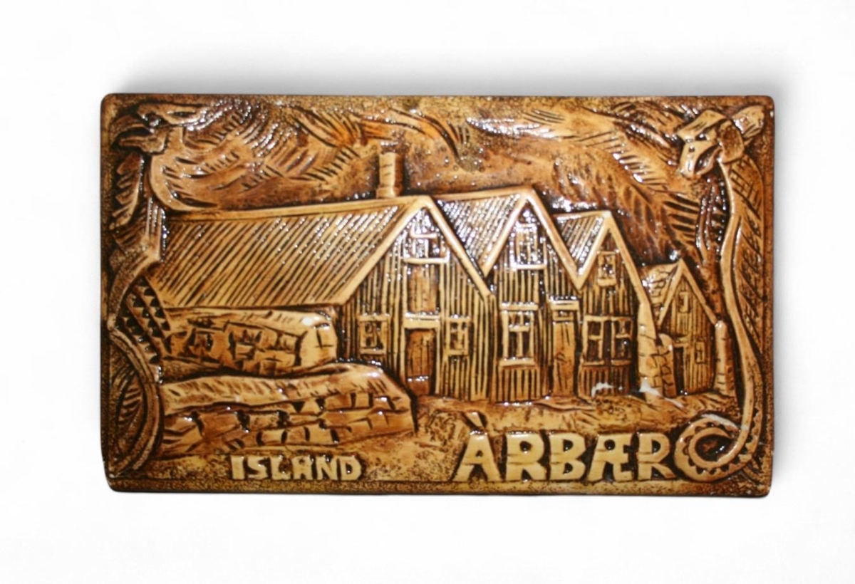 Veggskjöldur, úr gifsi, brúnn að lit. Lágmynd af Árbæ. Drekamyndir umlykja bæinn.
