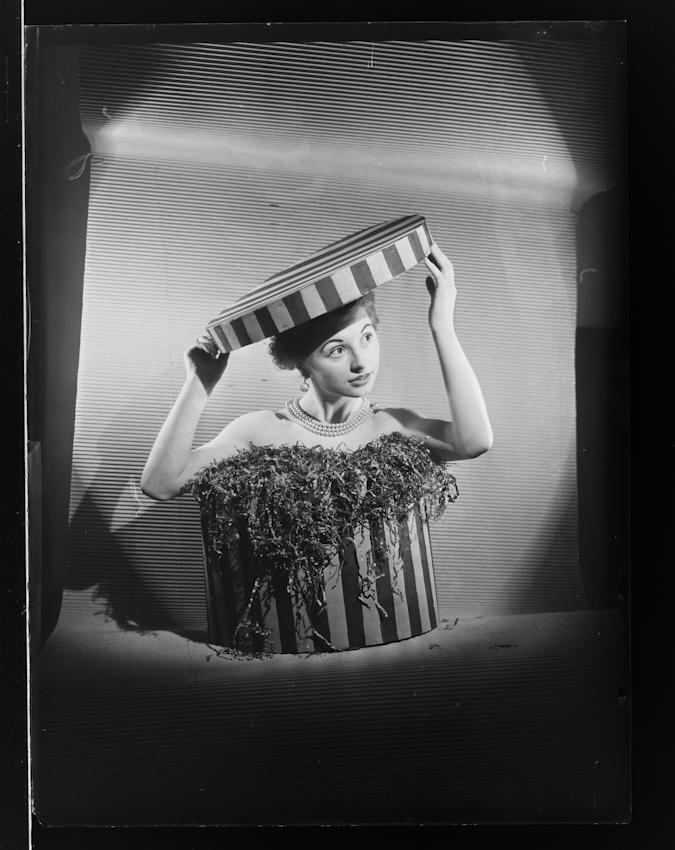 10-6 Stúlka í hattaöskju. Model: Soffía Karlsdóttir. Tekin 11. jan. 1951.
