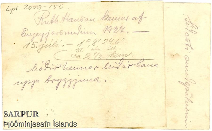 Á bakhlið er skrifað, fyrri mynd: Síðasti sundspölurinn. Seinni mynd: Ruth Hanson kemur af Engeyjarsundinu 1927 - 15. júlí. -- 1°,8',24,6''(kl., mín. sek.). Ca. 2 1/2 km. Móðir hennar leiðir hana upp bryggjuna.