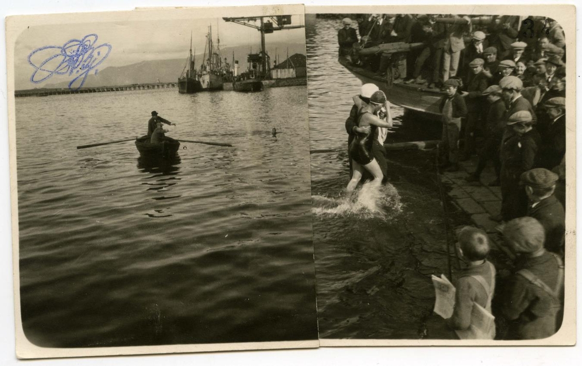 Tvær myndir samlímdar; t.v. eru tveri karlmenn á árabáti og sér í Ruth Hanson á sundi spottakorn frá bátnum, í baksýn liggja skip við bryggju undir kolakrananum. T.h. sést hvað Ruth Hanson er studd upp Steinbryggjuna af móður sinni, hópur áhorfenda fylgist með á bryggjunni og úr báti þar við.