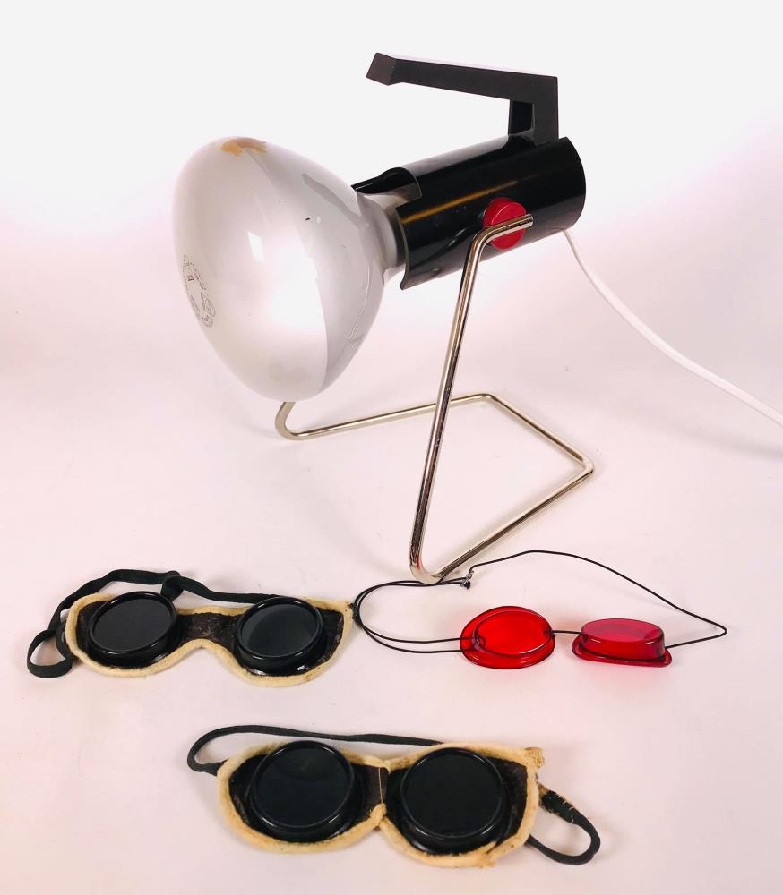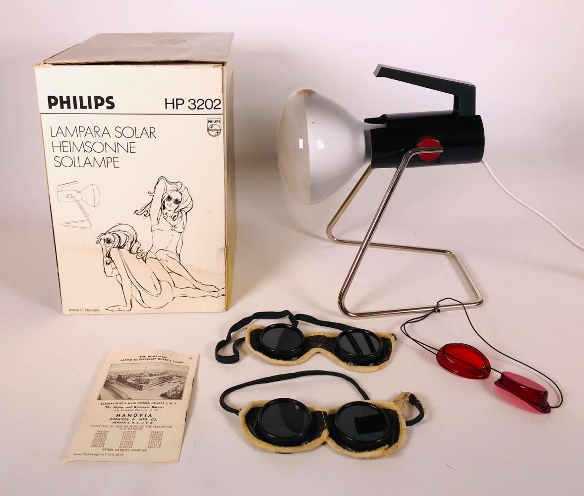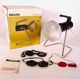 Ljóslampi (háfjallasól) ultrafjólublár keyptur nýr í USA, notaður af fjölskyldunni en einnig lánaður vinum og nágrönnum. Er í upprunalegum kassa og honum fylgir 3 gleraugu, ein rauð úr plasti og tvenn með grænu gleri með leðurumgjörð, gleraugu til að nota í sólbaðinu og leggjast alveg yfir augun (eins og sundgleraugu). Leiðbeininga/upplýsingabæklingur fylgir með.