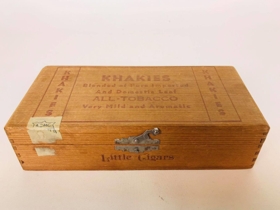 Vindlakassi úr tré "KHAKIS". Í kassanum eru ýmsar gerðir af blýöntum, t.d. einn með margföldunartöflunni og strokleður í íslensku fánalitunum