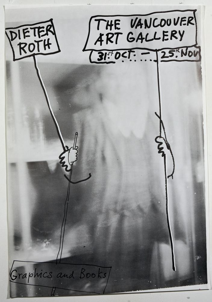 Plakat fyrir ferða-sýningar um bækur og grafík verk Dieters Roths. Gerð voru mismunandi plaköt fyrir hverja sýningu fyrir sig.Sýningarstaðir voru meðal annars: Vancoover art gallery, Kunsthalle Basel, Zuricher Kunstgesellschaft, Kunsthalle Baden-Baden, Mannheimer Kunstverein, Kunsterein Ludwigshafen, Kunstverein f.d. Rheinslande og Westfalen, Grabbeplatz, The Vancouver Art Gallery, Kunstverein e.v Kunstverein Ludwigshafen.