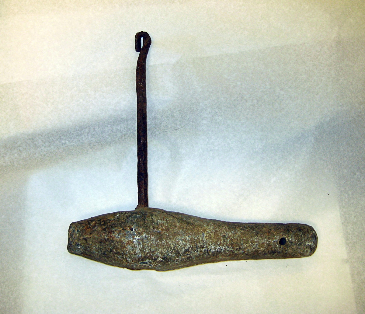 Sökka úr blýi með járntein sem gengur í sökkuna til að hnýta í snæri. Sakkan er í laginu eins og fiskur sennilega til að hún snúi uppí strauminn.