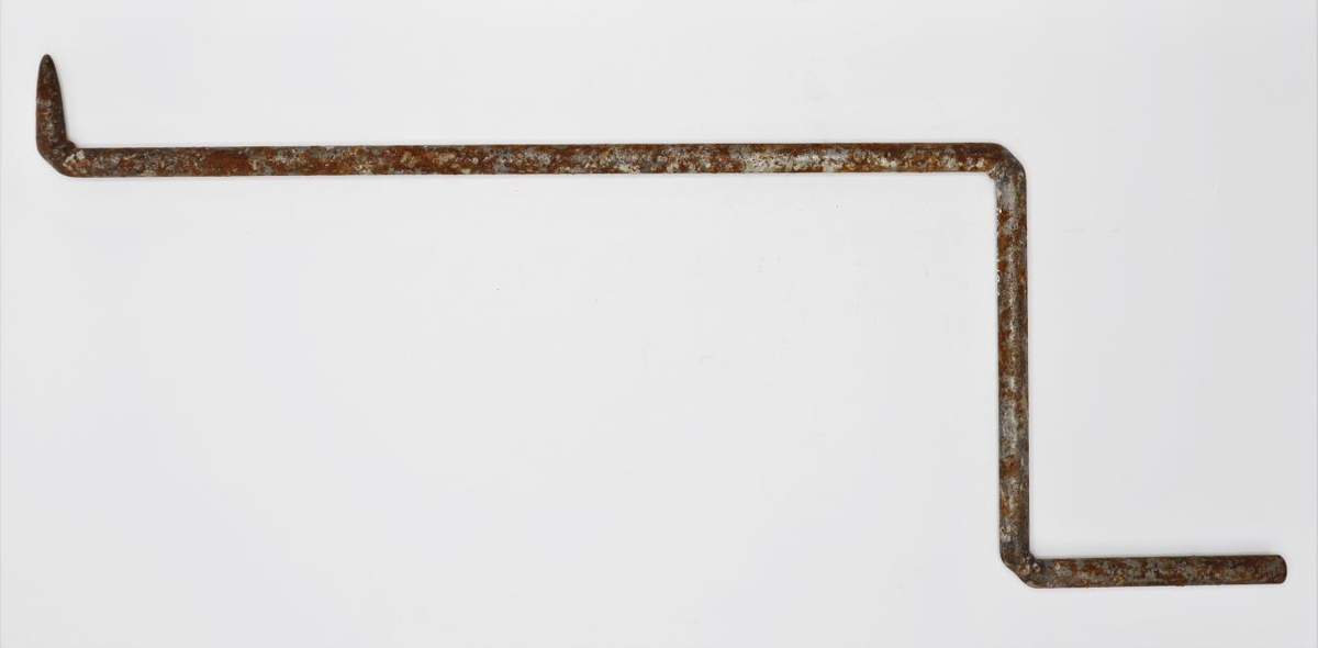 Mótakrókur. 14 mm. stálöxull sem er búið að beygja eins og sveif með spíss í vinkil á lengri hlutanum. Heimasmíðaður.