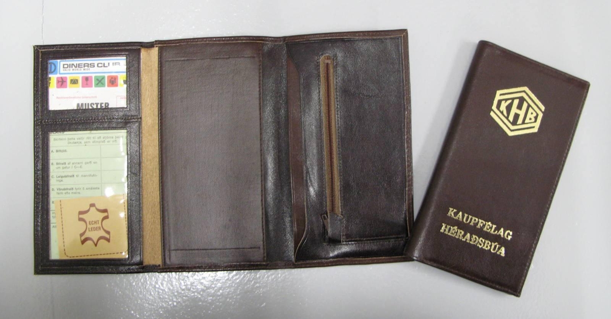 Tvö ónotuð leðurveski úr brúnu leðri. Eru þreföld og ætluð fyrir ávísanahefti, skírteini, seðla og mynd. Veskin eru með áprentuðu merki KHB og nafni Kaupfélags Héraðsbúa - með gyllingu.
