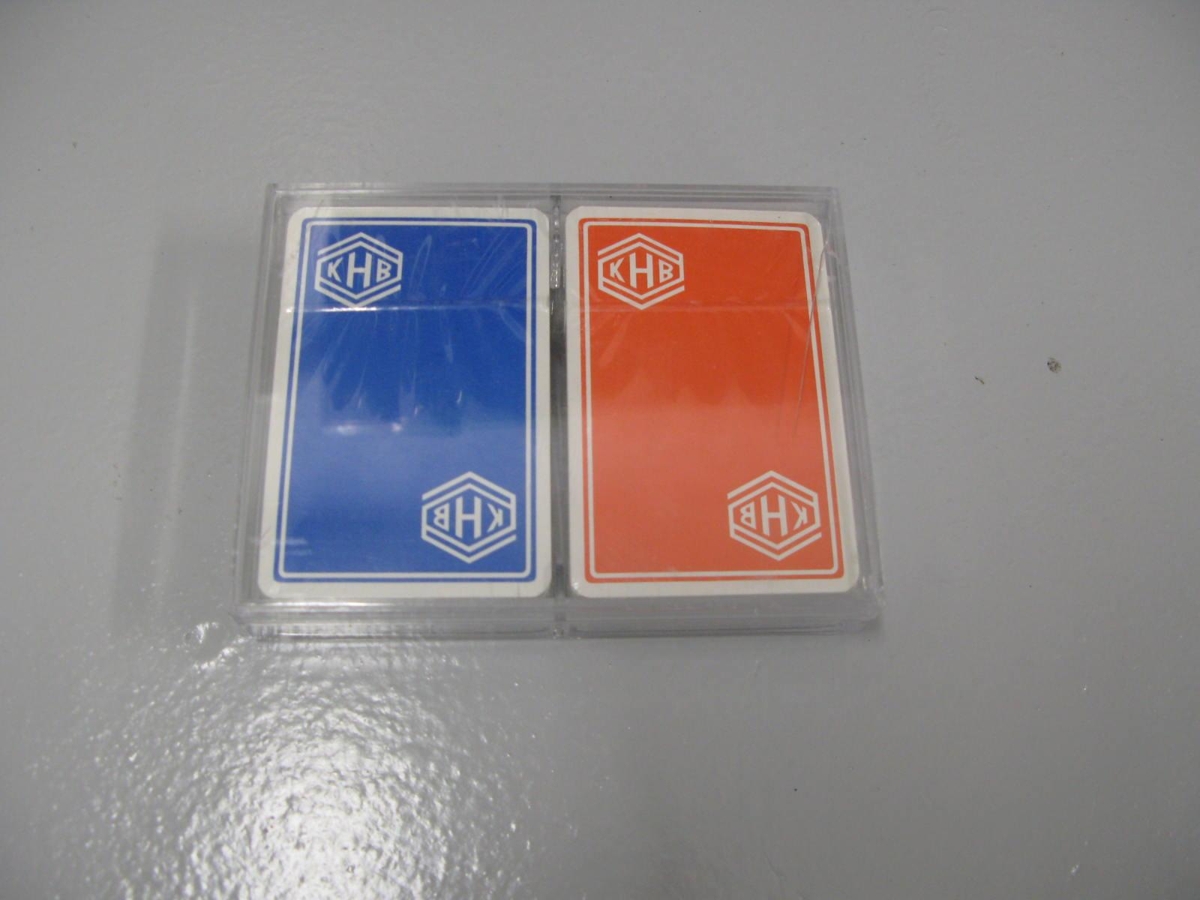 Glær plastkassi með tveimur spilastokkum öðrum rauðum en hinum bláum. Báðir stokkarnir er merktir með merki KHB og voru ætlaðir til gjafa.