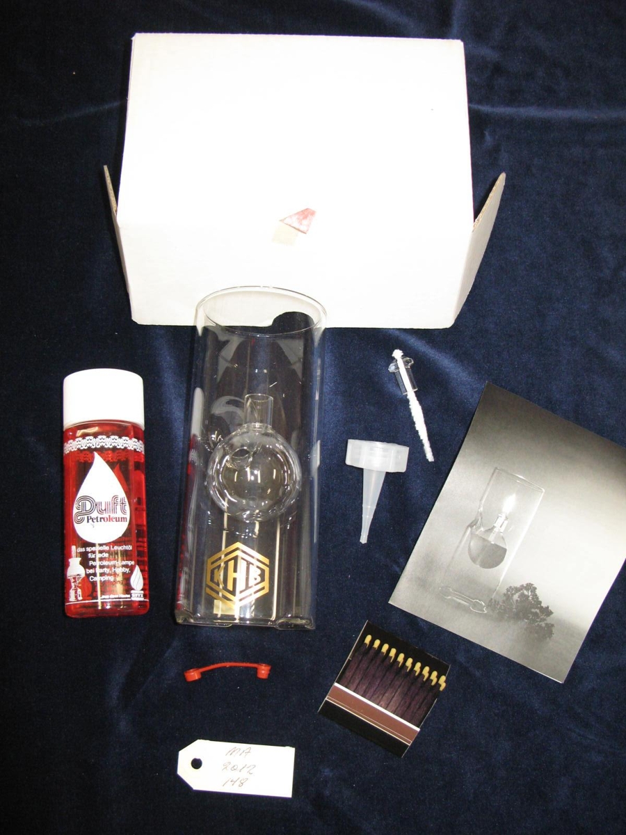 Nútíma olíulampi úr handblásnu gleri. Staukur með kúlu inní sem sett er olía í. Glerstaukurinn er með gylltu merki KHB. Í kassanum fylgir olía og eldspýtur. Annar kassinn er hvítur en hinn er pakkaður inn í rauðan gjafapappír með svörtu bandi og slaufu. Á honum stendur: "Petronella - bringt den Zauber Wohliger geborgenheit". Var ætlað til gjafa til starfsfólks og valdra vina KHB.