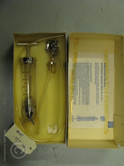 Blár kassi sem á stendur "Rotanda spritze". Inn í kassanum er einhverskonar inngjafasprauta, líklega notuð við dripp eða blóðgjöf? Kassinn silfurlitaður með bláum stöfum og framleiðandinn er "Rotanda DBG". Kom frá Fjórðungssjúkrahúsinu í Neskaupstað.