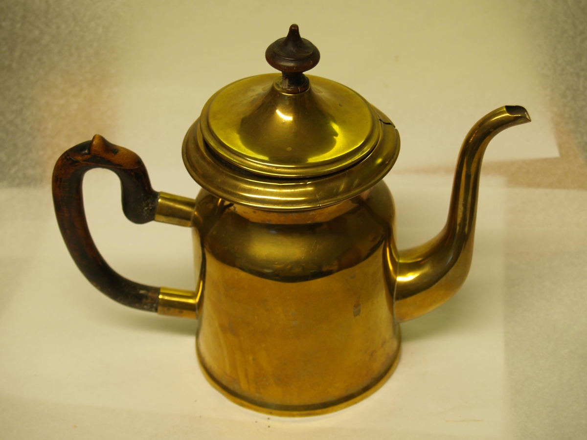 Kaffikanna úr messing. þvermál við botn er 12 sm, hæð með loki 21 sm, lengd frá handfangi að stút 24 sm. Sprunga er komin í efstu brún könnunar. Handfang úr tré, etv. hefur handfangið fengið viðgerð. Tréhnúður er á toppi loksins, sennlega eftir viðgerð.