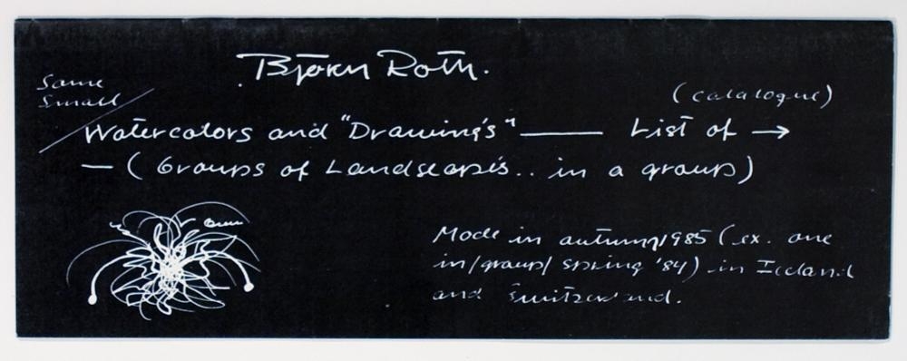 Sýninga og söluskrá yfir teikningar og vatnslitamyndir af íslensku landslagi: framleitt á Íslandi og í Sviss: allar myndir svarthvítar og texti handskrifaður.