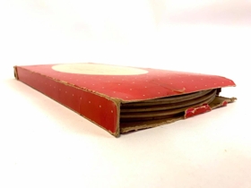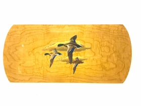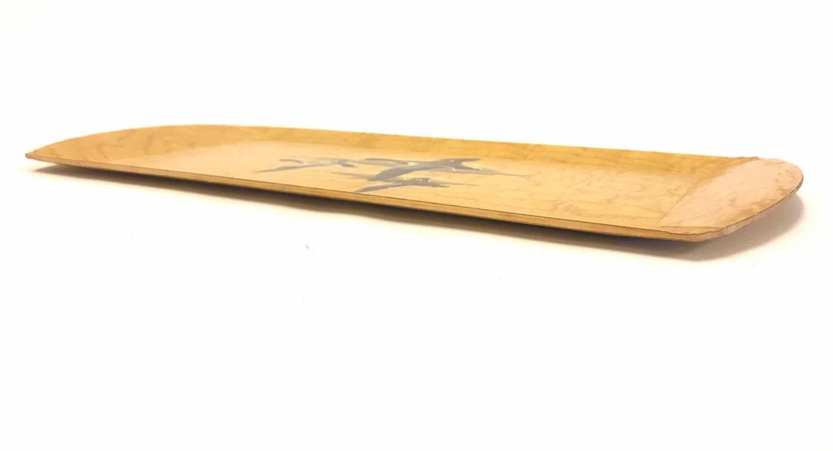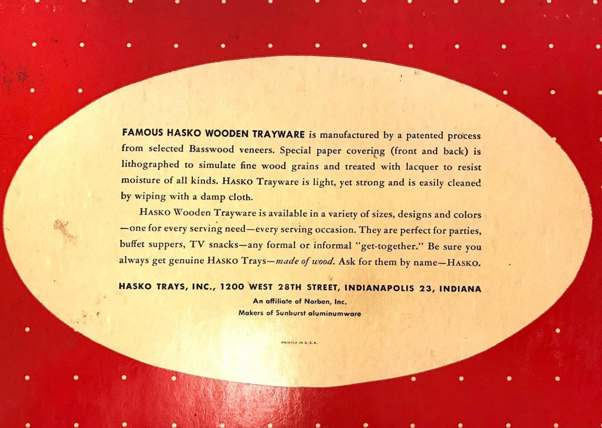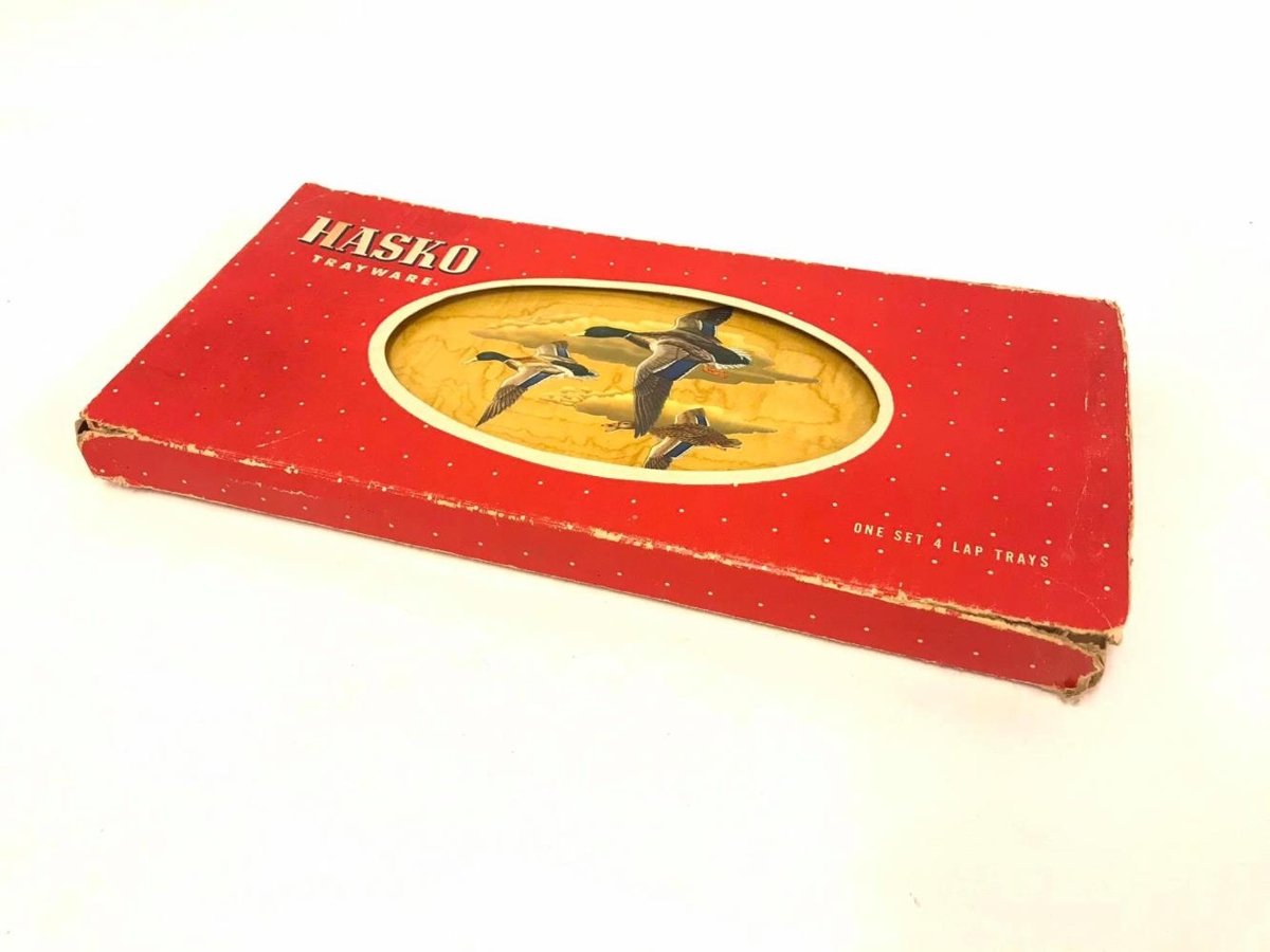 2 kassar, upprunalegar umbúðir, af matarbökkum úr viði. Rauðir kassar með sporöskjulaga opi yfir myndskreytingu bakkanna, 3 endur á flugi. Sama mynd á öllum bökkum. Á kassanum stendur : Hasko, Trayware. One set 4 lap trays. (eru samt 6 í pakka)