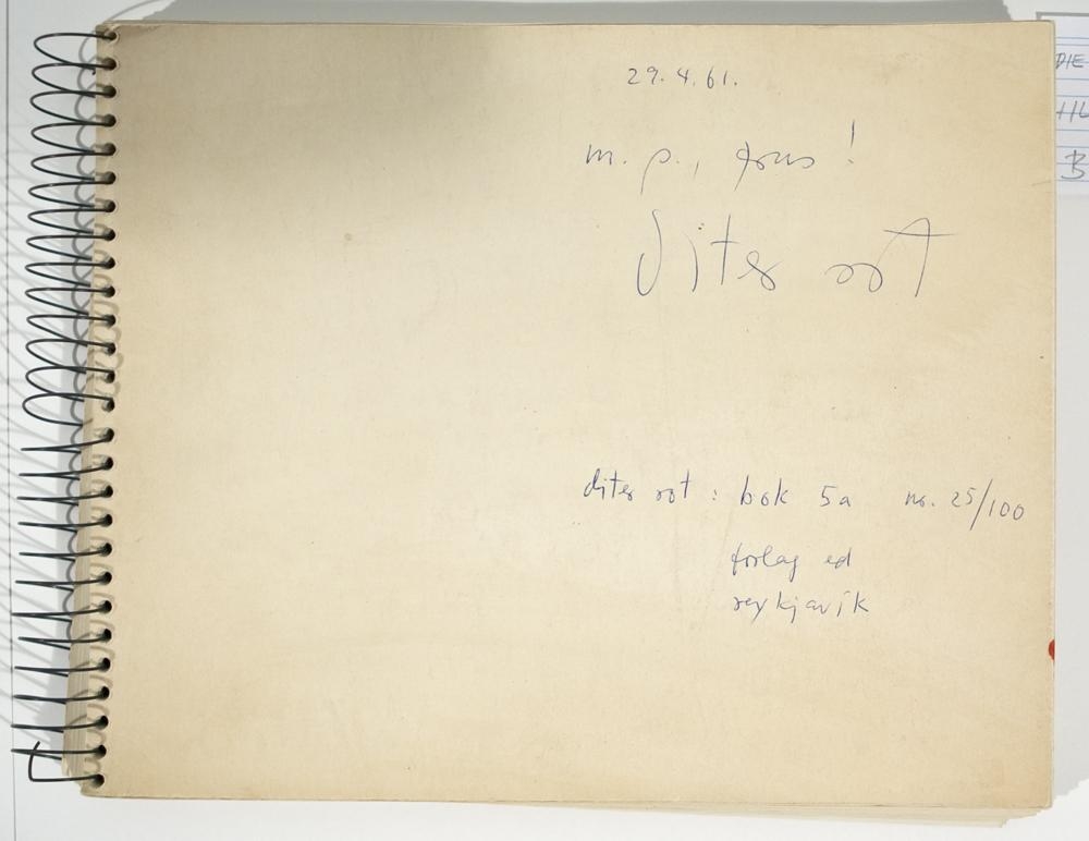 Ljós bók í gormabandi; gormur svartur og sver: forsíða árituð með bláum kúlupenna; handskrifað: innihald er svartar og hvítar grafíkmyndir; sama formið prentað ítrekað á sömu blaðsíðu.