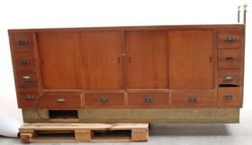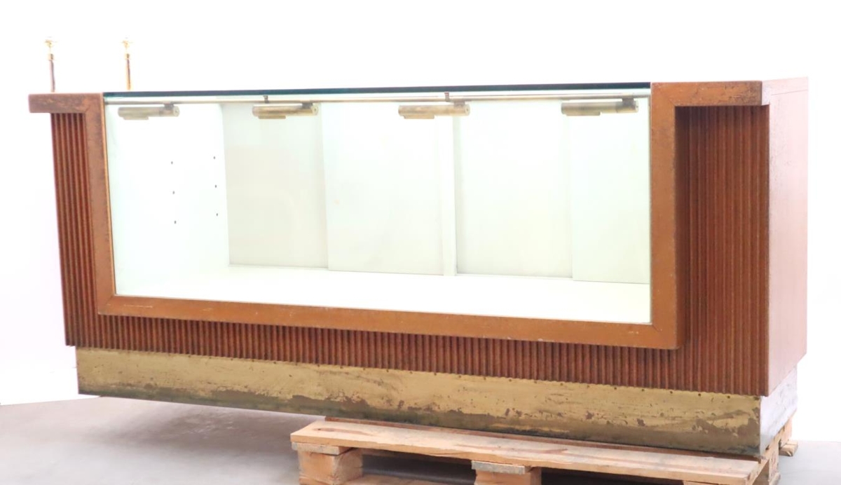 Afgreiðsluborð í versluninni "Egill Jacobsen" í Aðalstræti, Reykjavík. 1950 komu í verslunina nýjar innréttingar; m.a. þessi, sem blasti við hægra megin við viðskiptavinum þegar inn var komið, sneri í N-S. Borðið, sem er viðarklætt með messingklæddum sökkli, hefur glerplötu að ofanverðu og að framan. Inni í glerskápnum eru fjögur ljós, úr messing. Hægt er að opna hurðar að aftan, eða þeim megin sem sneri að afgreiðslufólki. þar eru einnig tólf skúffur.