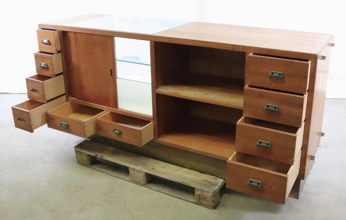 Afgreiðsluborð úr versluninni Egill Jacobsen í Reykjavík. Borðið kom í verslunina um 1950. Að framan, sem snýr að viðskiptavini, er borðið lokað, en með nokkuð stórum glerskáp. Hinum megin eru 10 skúffur, tvær skápahurðar sem opnast í glerskápinn og tvær stórar hillur. Borðplatan er nánast til helminga úr tré og gleri. Sökkull borðsins er klæddur messingplötu.