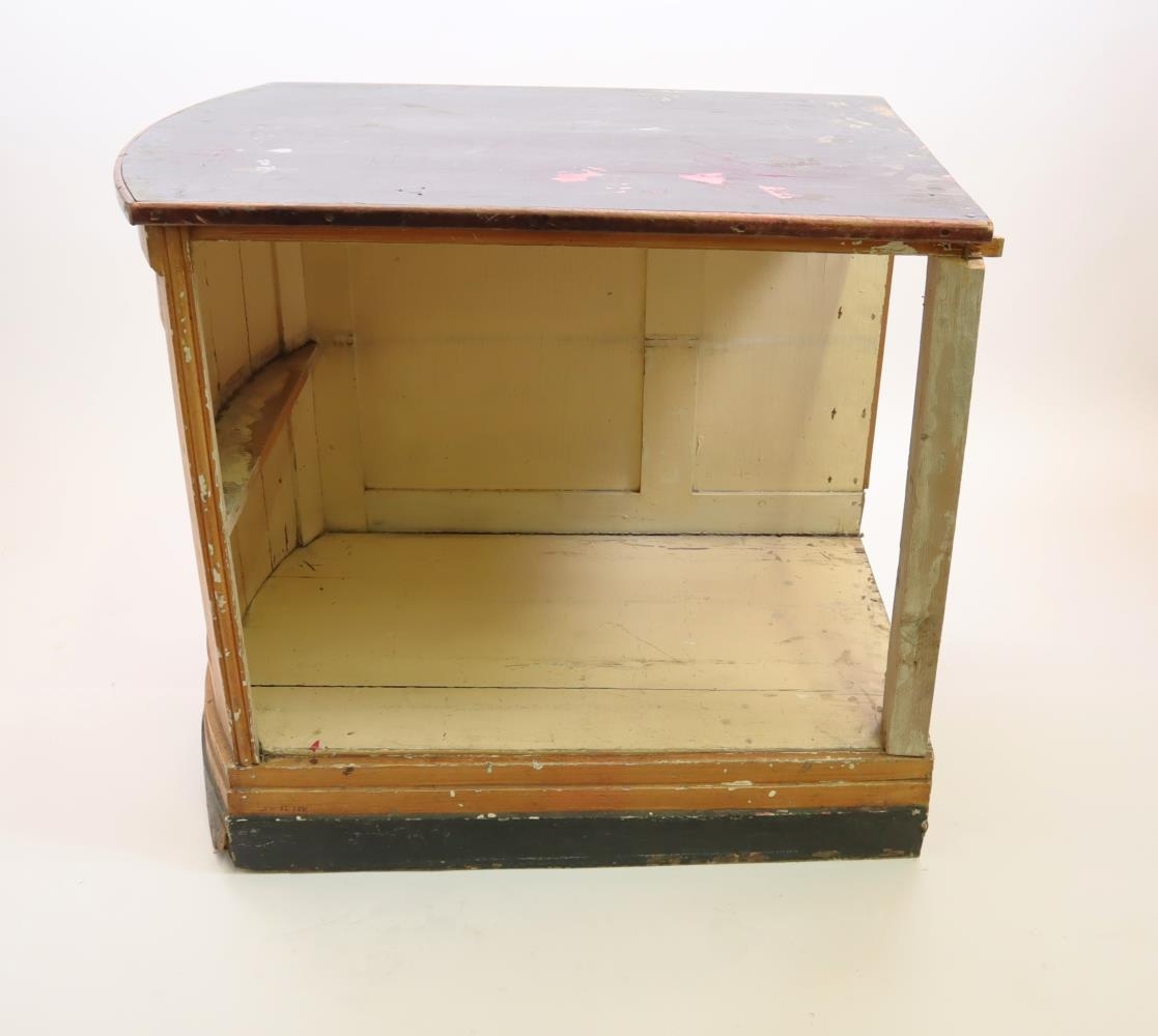 Hluti af afgreiðsluborði / innréttingu úr verslun Egils Jacobsen frá því fyrir 1950. Brúnt öðrum megin (framhlið) með svartmáluðum sökkli. Linoleumdúkur á borðplötu. Að innan er borðið ljósmálað.