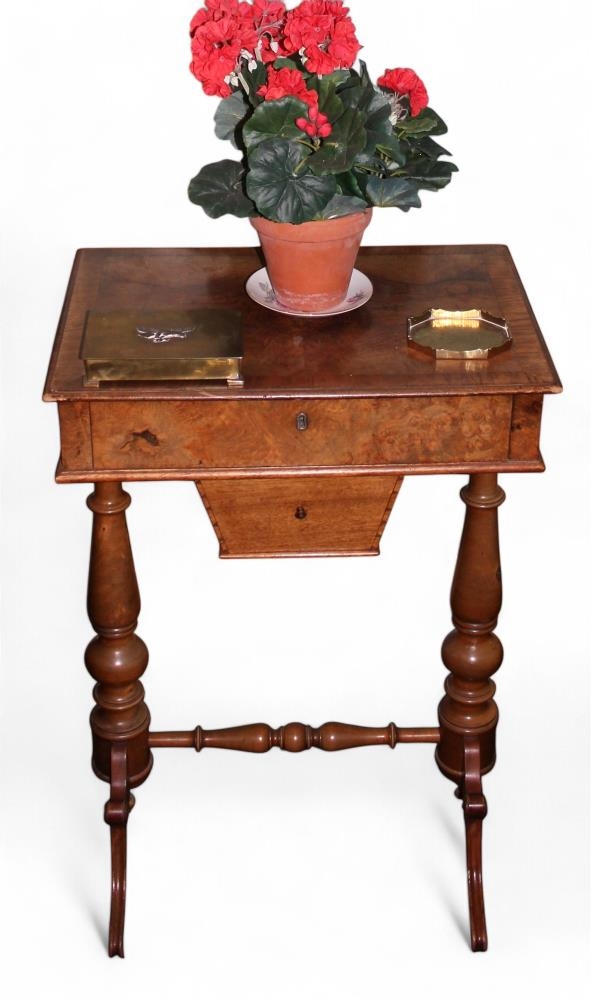Borðplata saumaborðsins er á hjörum og má lyfta upp.Blasa þá við 11 smáhólf fyrir tvinnakefli,nálar og aðra smáhluti. Áhverju hólfi er pólerað lok úr sama viði og borðið sjálft.Undir borðplötunni (smáhólfunum) er nokkru minni en dýpri trapísulöguð skúffa ætluð fyrir garnhnykla og annað saumakyns. Nálar, nálahús brot úr skeifu og litlar hespur eru í hólfum saumborðsins. Lykill upprunalegur.