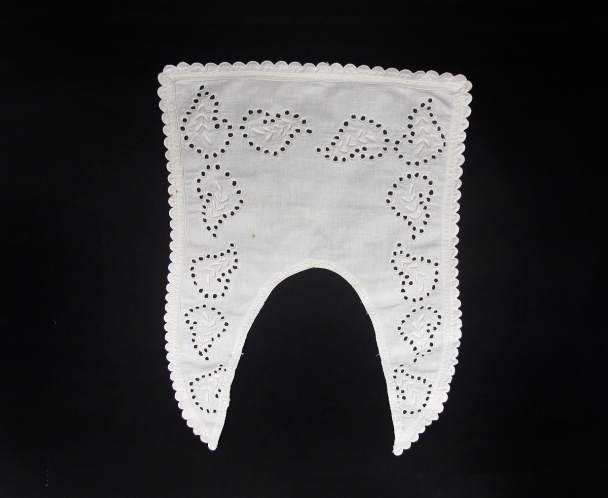 Útsaumaður kvenkragi úr hvítu lérefti. Hann er með hvítsaumi og hringlaga götum sem kappmellað er í kringum. Með brúnum er hvít léreftsblúnda Kraginn er í góðu ástandi. Hann er saumaður af móðurömmu gefenda, Katrínu Láru Stefánsdóttur (f. 1884, d. 1976).