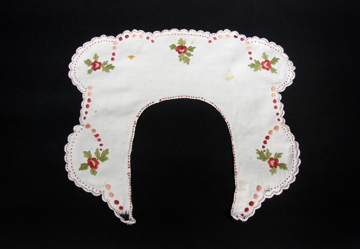 Kvenkragi úr hvítu bómullarefni. Hann er útsaumaður blómum og skrautdoppum í rauðum, bleikum og grænum litum. Kappmellað er með brúnum og þar í saumuð rauð útsaumsspor til skrauts. Kraginn er orðinn eilítið slitinn og blettóttur en er annars í góðu ástandi. Dúkurinn er saumaður af móðurömmu gefenda, Katrínu Láru Stefánsdóttur (f. 1884, d. 1976).