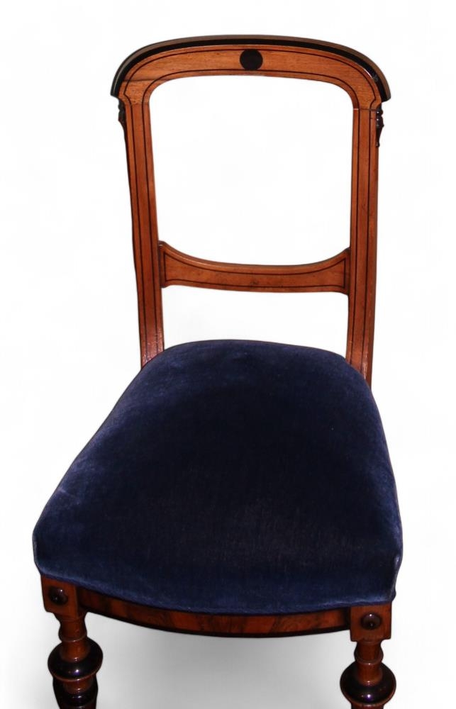 Stofustóll, stólsetan er stoppuð og klædd með bláu plussáklæði.Tréverk er úr mahognýi, vönduð smíði. Framfætur renndar. Bak er lítið eitt íbogið með þverslá nálægt setu. Stólarnir eru fjórir að tölu.