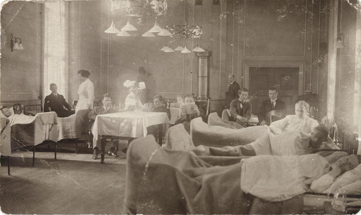 Samkomusalurinn á Regnesens-stútentagarðinum í Kaupmannahöfn sem tekinn hefur verið undir sjúklinga í spönsku veikinni 1918. Rúmin standa meðfram langveggjunum og er borð að miðju gólfi. Á myndinni liggja sjúklingar í rúmum, hjúkrunarkonur ganga um og fullklæddir gestir sitja við sum rúmin.. Á bakhlið eru nöfn flestra listuð upp, allt eru það dönsk nöfn nema stud.mag. B. K. Þórólfsson. Þar er einnig skrifað: Spansksygelasarettet på Regensens festsal for Kommunitets almene.