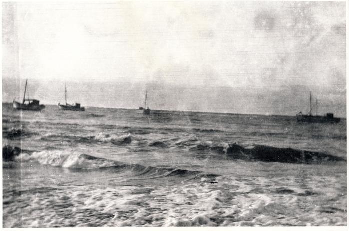 Mynd af fjórum bátum sem liggja við festar. Á bakhlið er ritað, "Fv. Freir, Öðlingur,? Littli sæfari, Hallion eða Nórrona. Ljósm. Sigþór Guðjónsson."
