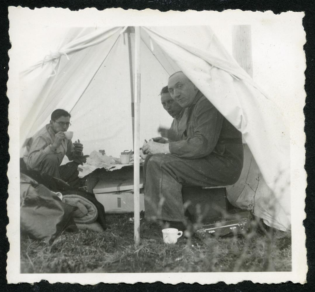 Þrír karlmenn sitja að snæðingi inni í tjaldi. Undir stendur: Miðdegisverður.