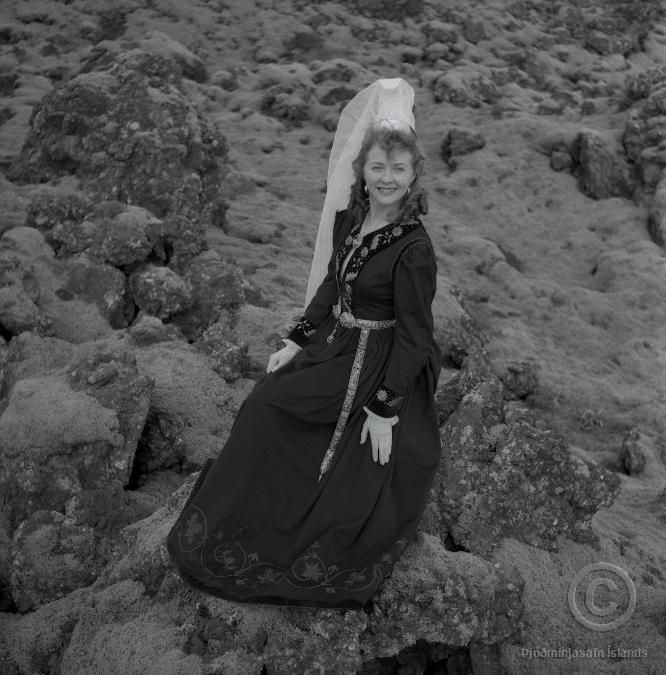 Fjallkonan: Guðbjörg Þorbjarnardóttir leikkona í skautbúningi 17. júní 1955 í hruaninu á leið til Krýsuvíkur.