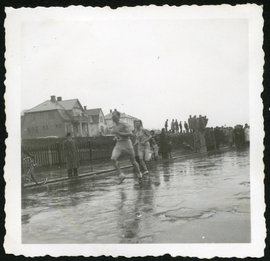 Þátttakendur í víðavangshlaupinu keppa í rigningu á Melavallinum. Við myndina er skrifað: Íþróttamyndir 1944. Víðavangshlaupið.