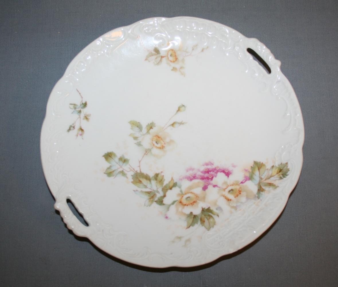 Diskur eða grunn skál undir kökur eða önnur matvæli. Hvítt postulín eða leir, blómamunstur. Tveir hankar.
